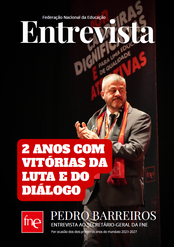 ![]() | A 21 de maio de 2023, Pedro Barreiros sucedia a João Dias da Silva na liderança da FNE. Desde aí muito aconteceu e por isso realizámos um Especial Informação a marcar a data com uma entrevista de balanço desta primeira metade de mandato. Eleito Secretário-Geral da FNE em 21 de maio de 2023, Pedro Barreiros faz um balanço extremamente positivo dos primeiros dois anos de mandato. A resposta a uma instabilidade persistente no setor da educação foi “reivindicar com firmeza, mas com responsabilidade”. Resultados? O acordo histórico da recuperação do tempo de serviço em maio de 2024, o acordo da Mobilidade por Doença em março de 2025 e o aumento do número de associados. A meio do caminho ficaram a revisão do ECD e avanços concretos nas condições de trabalho, salariais e carreiras do Pessoal de Apoio Educativo. Pedro Barreiros gostaria de ter resolvido as ultrapassagens na carreira docente. Mas afirma que tudo se pode esperar “do profundo sentido de missão da FNE”. |